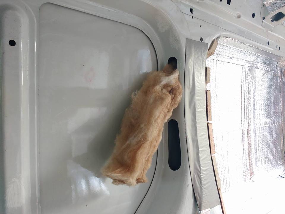 3. So running out of patience, with smaller places like the back door, I decided to use rock wool which was given to me by my neighbour for free. But I knew rock wool was really bad for you if you breath it, so I had to make sure all the holes were plugged and sealed tight. They also absorb moisture in the air and get wet and soggy. As mentioned earlier, water with metal = rust so best to avoid any moisture getting into it.