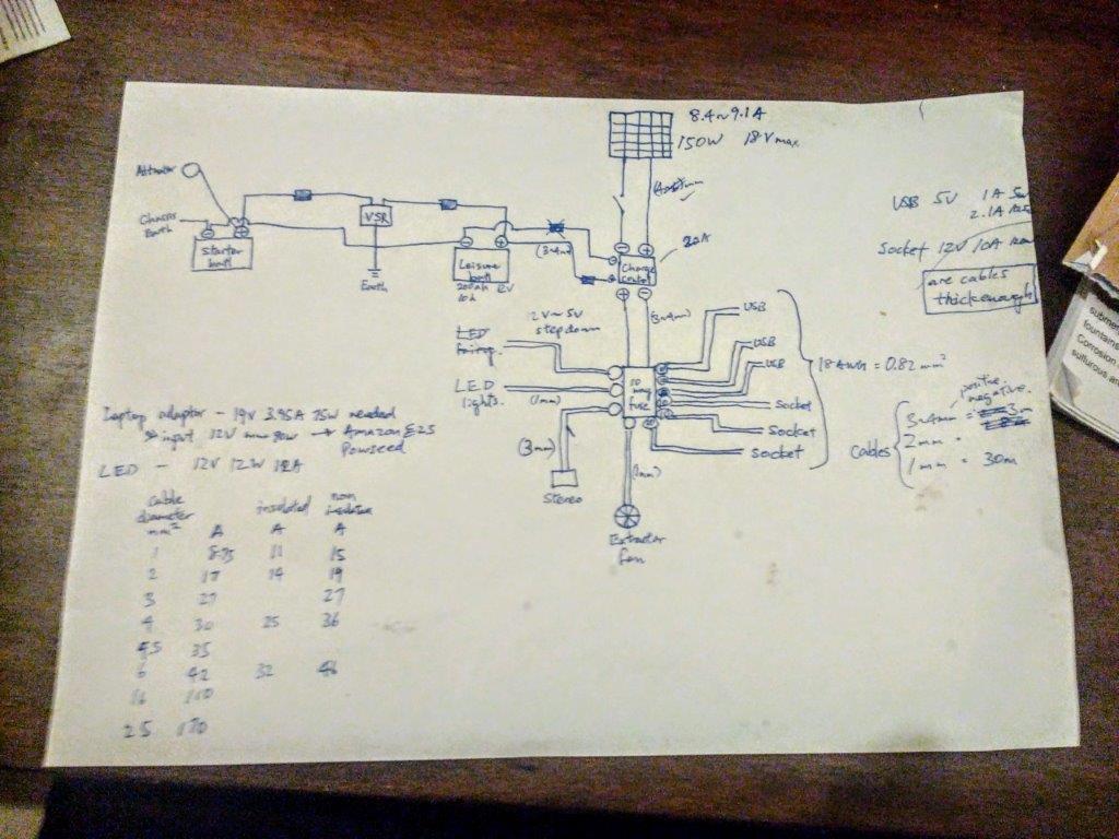 The initial task was to figure out all the electric equipment that I wanted to bring with me or to install in the van and to list out their power usage. My laptop, phone, speakers, headphone, battery pack, camera, extractor fan, the number and types of lights to install etc. And jot down exactly how long and how much I used each item. This allowed me to calculate the exact amount of power I needed per day which came to about 33 amp hours.