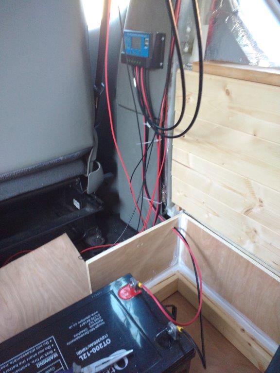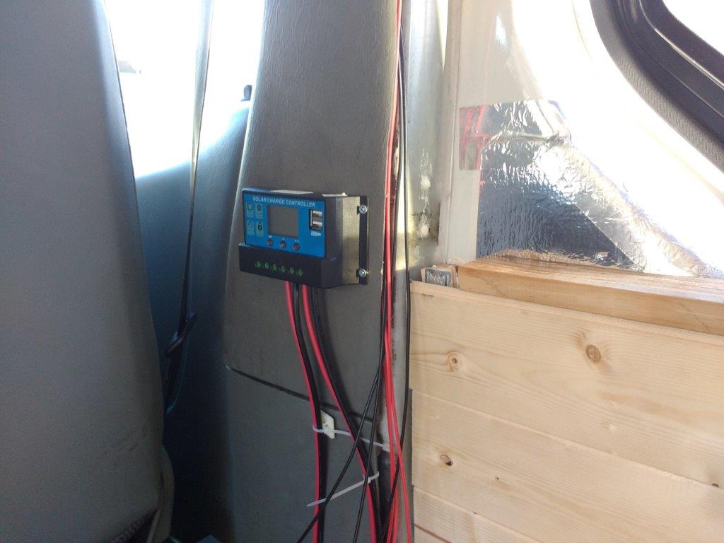 Due to the panels coming with only a few meters of cable, I had to place the charge controller right next to the driver seat, behind a board that separates my kitchen and the cab. I regret this decision quite a bit since not being able to monitor the battery levels have lead me to discharge the battery completely once. (I have since worked out that the charge controller has a discharge limiter that can be set to whatever figure you want.) I would recommend anyone building a solar system to purchase extra cable and place it in a good visible location so that it’s easier to monitor your usage.