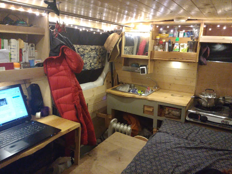 I bought an excessive amount of lights for such a small van. 6 spot lights, 6 down lights and fairly lights that are wired around the circumference, all of them LED for efficiency. However, I highly recommend diversifying the lights as it’s easier to not switch on the light, then to having to redo the cabling and install new ones. I’ve also found out that it allows many different lighting configurations which changes the scenery and gives an illusion of depth. When I’m working at night writing this blog for example, I may have all the lights on, whereas before going to bed, I might just have the fairy lights or the desk lights. A more diffused but brighter light when cooking and overall spot light where I enter and exit and so on. They’ve come a long way in achieving a much warmer colour than they were even just a few years ago.