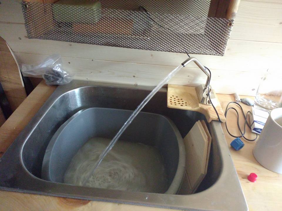 The sink was another waste of money and time. I spent so long looking for the right sized sink with the correct dimensions and spent a good amount of money, only to discover that I mostly do my washing up in the pots that I’ve cooked in, and if there’s a lot, I use the grey plastic bowl in the picture above and chuck the grey water outside (I use ecover). It makes so much more sense to do it this way, than to run the water into a grey water tank that you have to empty and clean – both bulky jobs. Now the sink is acting as a magnet for mess, accumulating debris and miscellaneous items.