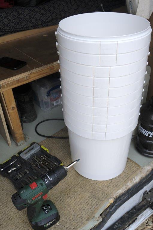 Update: I would try and get double the amount of buckets so that one set has holes and the other set has no holes. The ones with no holes can be used to contain the main bucket, reducing the need for bin bags.