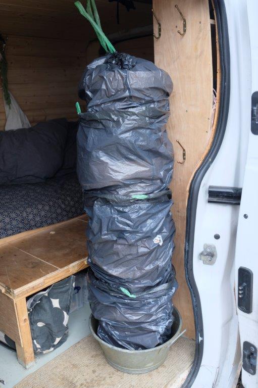 My multifaceted van in a mushroom grow room set up. It works well as I have an excuse to warm my van with a heater and keep at a comfortable living temperature while not having to worry about humidity leaking into the air. My hygrometer measuring humidity in my van has remained at normal levels of 40 to 60%. The bucket below was a precaution and no longer used. The smell had altogether disappeared after a few days but I’m still keen to get the previously mentioned ash processing to make sure it’s pleasant off the bat.