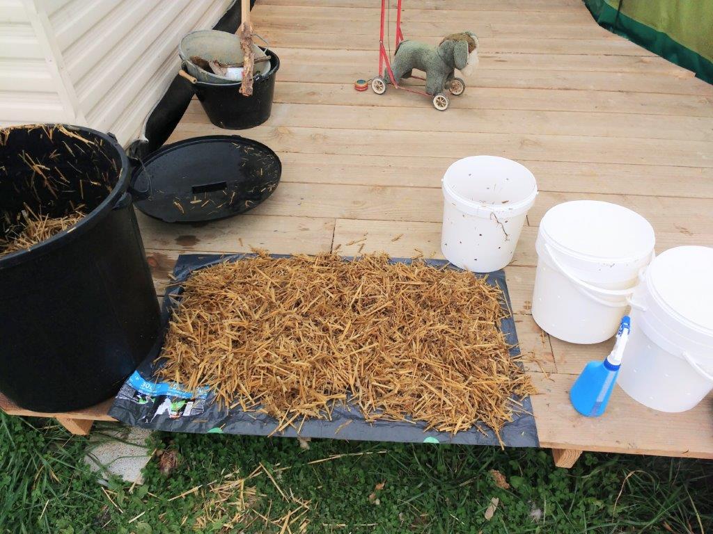a) Dealing with smelly straw from previous batch that didn’t seem to stop smelling despite aeration. I am slightly worried that anaerobic organisms are still alive and competing with oyster mushroom mycelium in the buckets. So ways of killing off those organisms in addition to aeration was needed.
