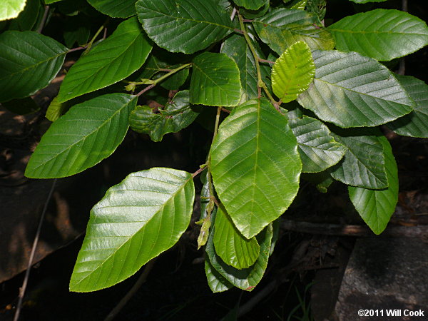 Leaf: The leaves of the common alder are short-stalked, rounded, up to 10 cm (4 in) long with a slightly wedge-shaped base and a wavy, serrated margin. They have a glossy dark green upper surface and paler green underside with rusty-brown hairs in the angles of the veins.