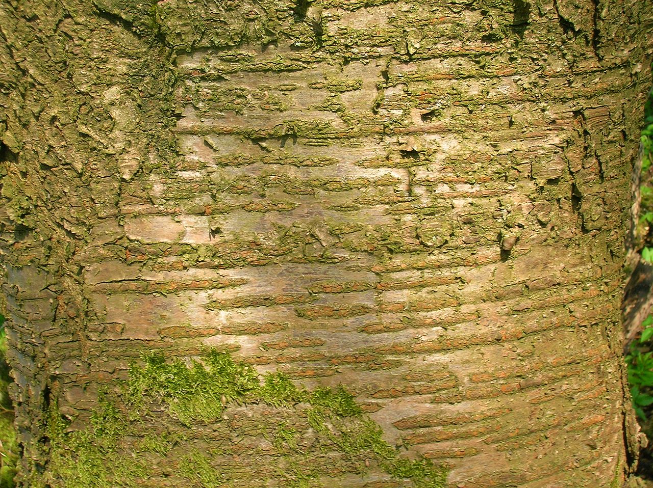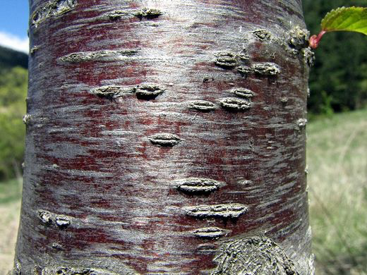 The shiny bark is a deep purplish or reddish-brown with prominent cream-coloured horizontal lines.