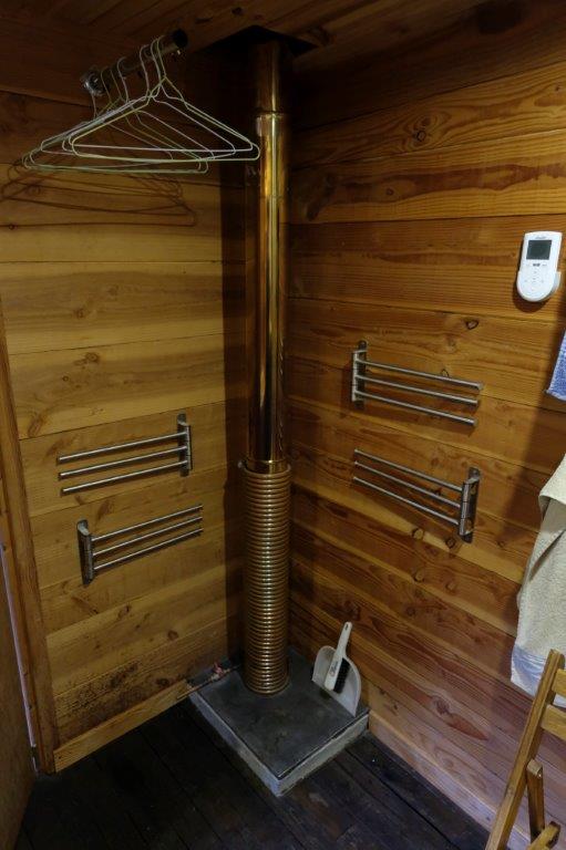 The fireplace is in the living room/kitchen area about a meter below where the copper piping starts. According to Sébastien, it’s not a good idea for the water to start boiling inside the pipe, so it’s best to keep a little distance from the actual heat source. Apparently, there are two different types of copper pipes and one of them bends pretty easily. He simply put a large log inside the chimney pipe to help withstand the force and to prevent buckling and bent the copper pipe around it. The tank is on the third floor and the convection is enough to keep the water circulating and achieve on average 50 to 60 degrees. It’s one of the systems that Sébastien is happy about and would do it again if he ever built a house.