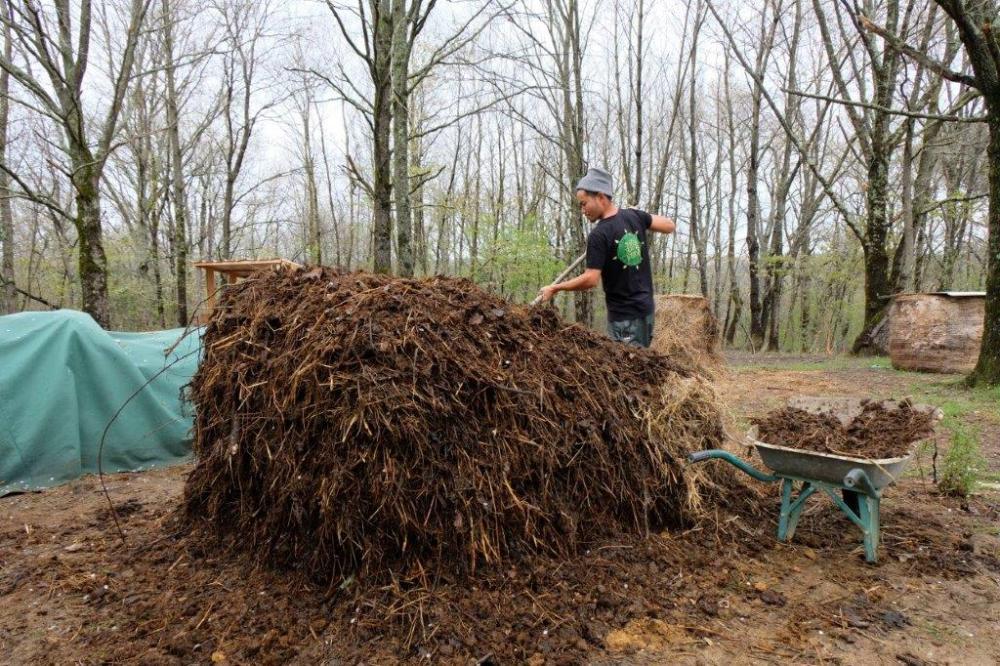 Tip: The best solution with minimum effort that I’ve come across was again at Thebeau’s farm where he created a meter cubed volume to start with and extended the compost pile longer into an elongated rectangle over time, adding daily build up of fresh green material and covering it with a layer of straw. I like this method for several reasons.