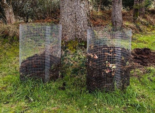 Aerobic decomposition, as the name suggests, works best when it has plenty of air through it. One easy way to achieve this is to build a wire mesh composter like the one pictured below. It’s great for maintaining air flow, cheap to make and easy to release and rebuild for turning or for applying. It’s also possible to add aerating structure to the compost by adding slightly slower decomposing materials like wood chips or very thin twigs in layers.