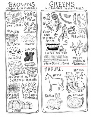 Without getting too technical (since the actual ideal carbon to nitrogen ratio, or C:N, is 25 to 30:1), the ideal is to mix about the same amount of high carbon materials that are normally quite BROWN with high nitrogen materials that tends to be GREEN. You can read more here and here if you want to get more mathematical.