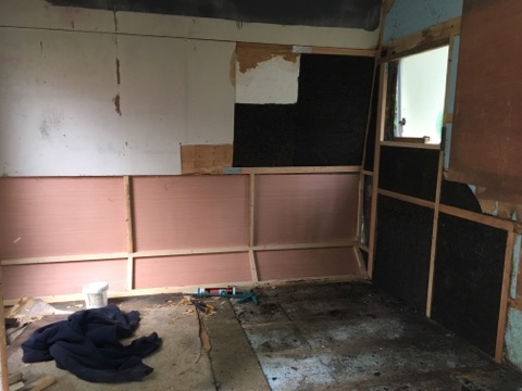 In the second week, it felt like we progressed faster with the batons going in, cork insulation refilled and ply sheets cut and panels back on. Though, again, the skewed frame meant that each piece had to be measured and adjusted several times to fit, which was a right pain in the arse. But once the hundreds of holes were plastered, sanded smooth and paint began to go on, it really felt like a completely different space.