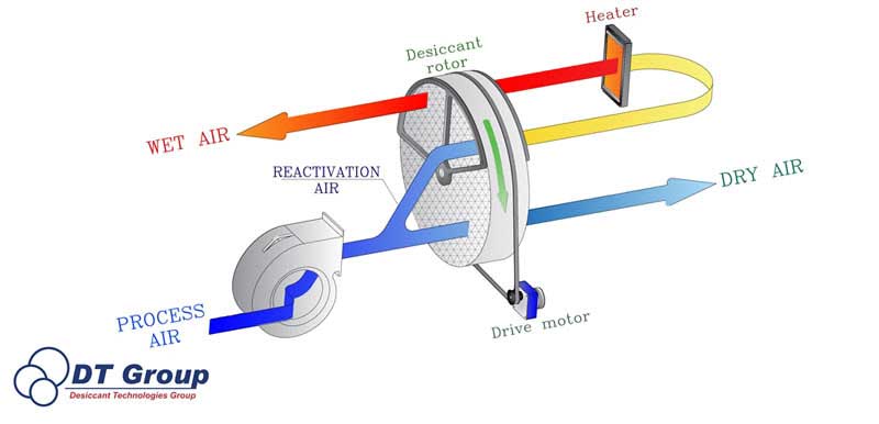 A more recent addition called desiccant dehumidifier uses a fan to push air through a silica gel or Zeolite rotor that absorbs moisture. A portion of the rotor is then blasted with hot air (90 to 140C) to remove the humidity and reactivates the desiccant wheel’s capacity to absorb more water. This absorption is effective even at very low temperatures down to 1C and is mechanically far more simpler than a compressor type, reducing the points of failures.