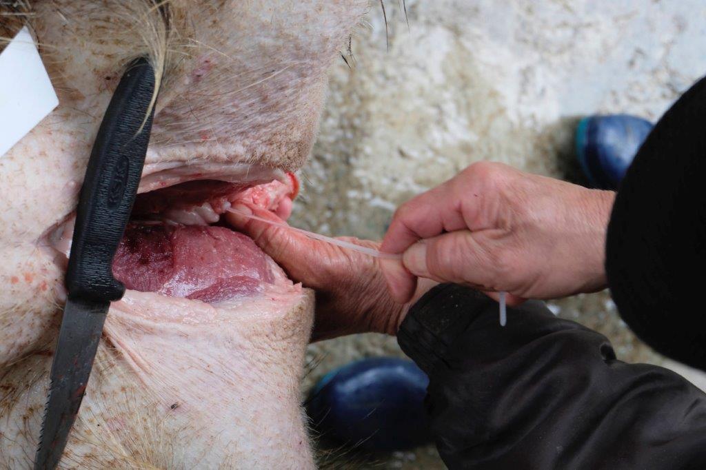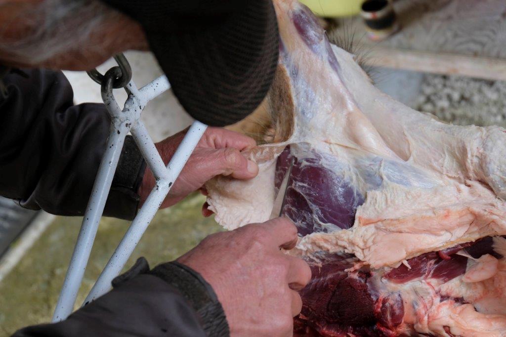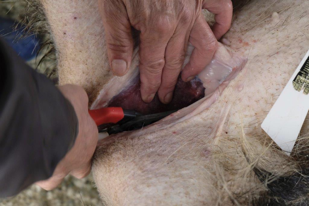 The tail is cut with a secateur which reveals the tail bone. This becomes the guide as you slice around the anus with the utmost care. You must avoid puncturing the rectum canal at all cost.