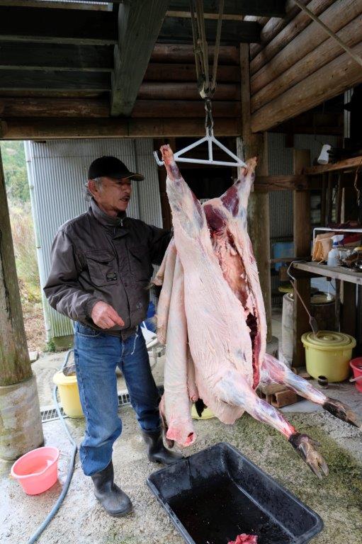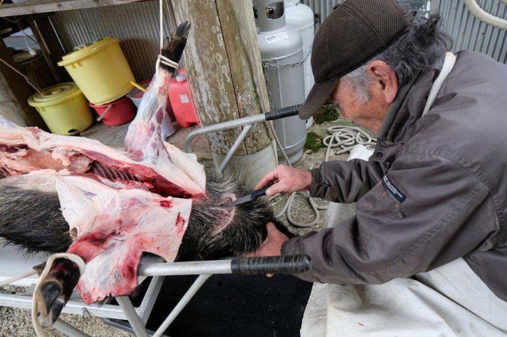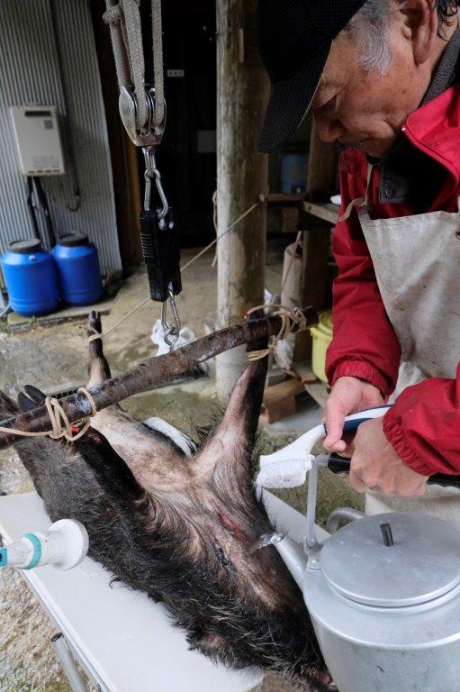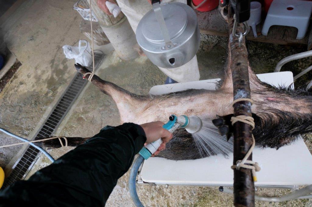 While the boar cools, the liver and other edible parts are extracted and the whole area is washed clean. This liver you see in uncle Kinuo’s left hand became the single best liver dish I’ve ever had. I couldn’t stop eating it and I’m not even a massive fan of livers. Apparently, boars are nothing compared to how good deer liver is. Couldn’t try it this time but I’m drooling thinking about it. Do pop back for auntie Kinta’s liver dish recipe in part 3.
