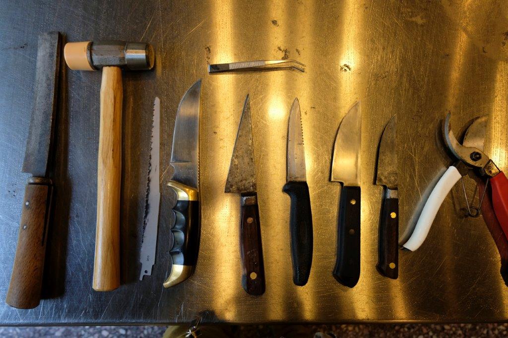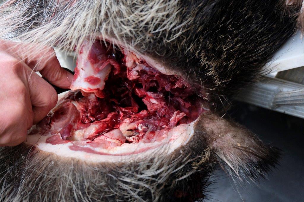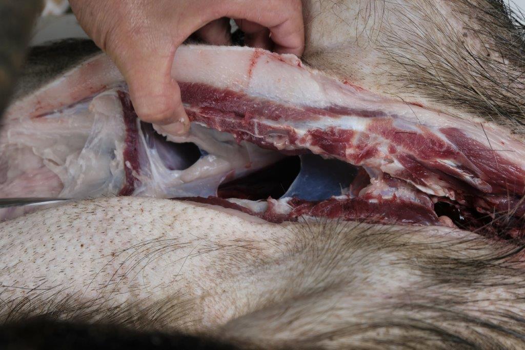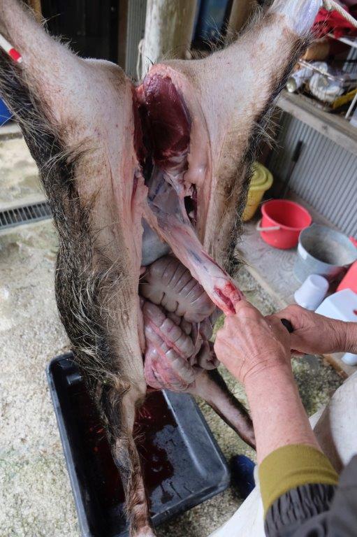 The skin and meat above the pubic bone is sliced carefully until the bone is revealed. It’s shaped almost like a bridge between the two legs with intestinal tracts above and rectum canal below. So another careful cut requiring very accurate knife maneuver to avoid poo carnage. The smaller boar’s pubic bone can be sliced apart with a secateur but a larger boar or most deers (whose bones are much harder than boar’s) requires the use of a hatchet.