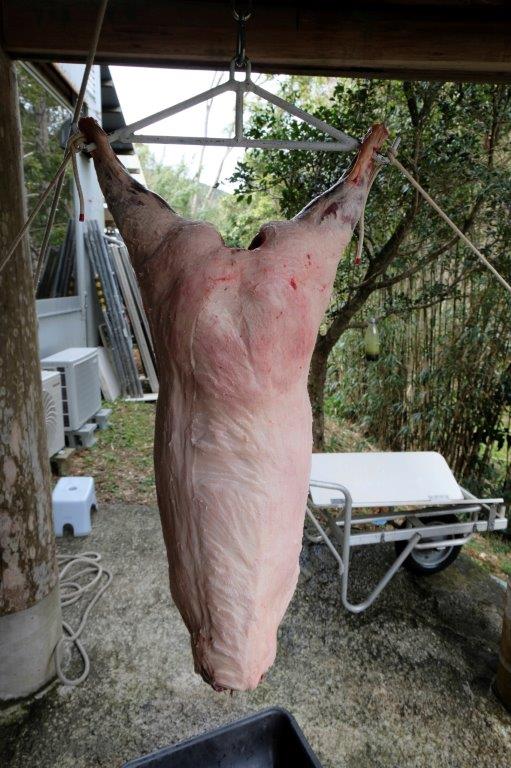 The legs are cut off and the skin around the ankles is peeled off to allow the hook to get between the Achilles heels. The rectum is pulled forward and the whole innards are peeled off gently with some nudging with a knife point.