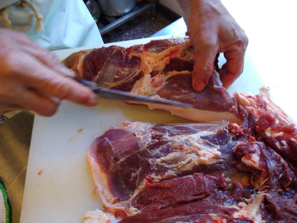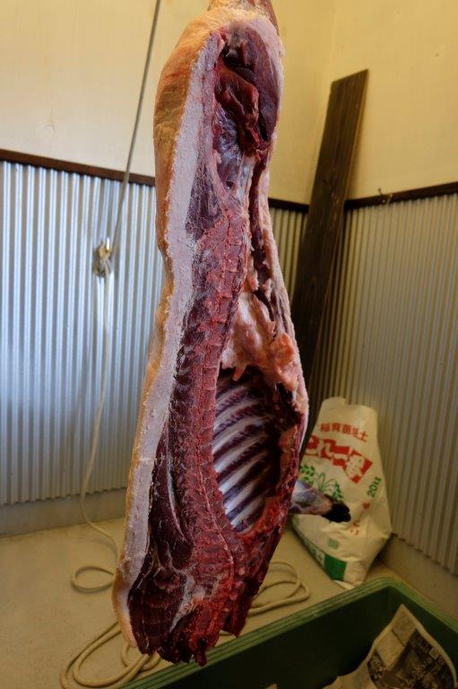 The half body is then divided into three chunks – leg, belly and shoulder. They are wrapped in absorbent meat paper and placed inside carrier bags to stop over drying. Those bags are placed in a fridge for 3 or 4 days to mature. The meat paper is changed at least once during this period so that any water that sweats out of the meat is properly absorbed and discarded.