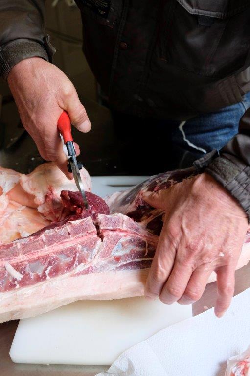 The boar is transferred inside and a reciprocating saw is used to cut through the back bone and to split the body in two. Note the thickness of the fat on its back. It’s so thick that some are sliced off to keep the perfect balance of meat and fat ratio but the left over fat is then made into the most incredible lard that adds magic to any dish you use it for.