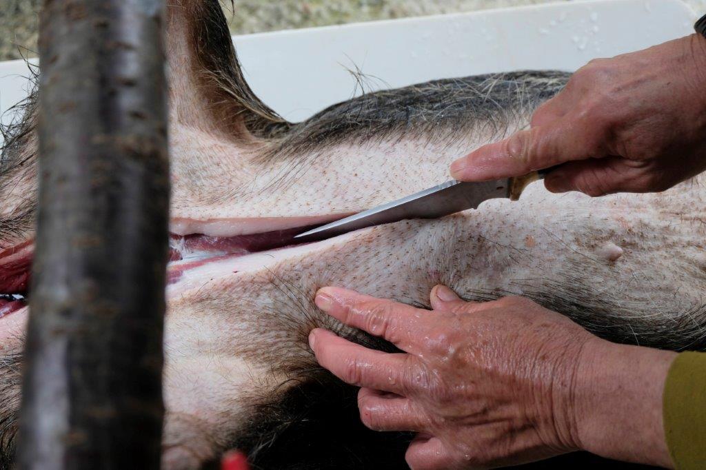 With a deer, it’s possible to literally peel off the skin since they’re much leaner, but with a boar it’s a slow methodical process of slicing between the skin and the fat. I’ve had a decent go on it and found that knife skills I acquired working in the fish industry is transferable here.