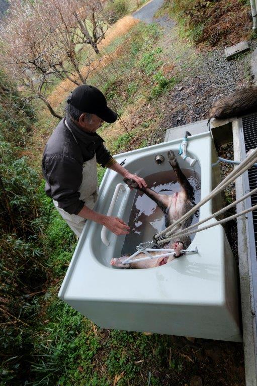 Immediately, the boar is lowered into the adjacent bath tub where a garden hose is set inside the intestinal cavity to cool down the body temperature as fast as possible.