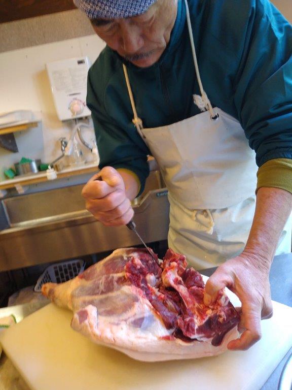 After three or four days of curing, the meat is deboned and cleaned of excess fat and tendons with Japanese precision. That’s right. The less tendons the better and it takes the pro several hours to go through a boar. The meat is formed into a suitable shape and frozen at -40 degrees, thawed partially to slice thinly on a meat slicer, packaged, labelled then frozen again ready to be dispatched.